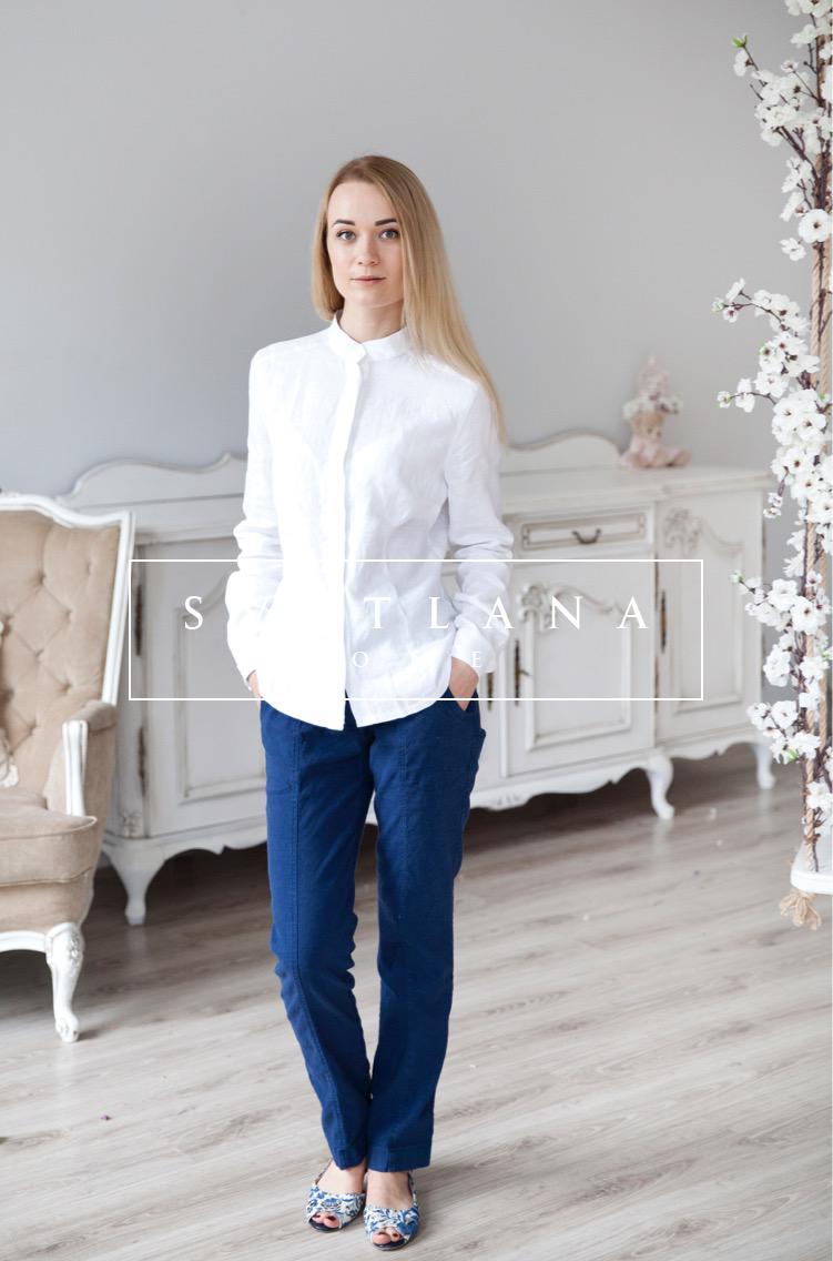 Брюки льняные с эластаном прямого силуэта слегка зауженные книзу. Спереди прямая отстрочка-стрелка, создающая эффект стройности. Модель с высоким поясом до талии на кокетке сверху, резинка на спинке для лучшей посадки по фигуре. Брюки благодаря добавлению эластана прекрасно смотрятся и корректируют форму ног. Высокая плотность ткани позволяет носить брюки не только летом, но и в прохладное время года.