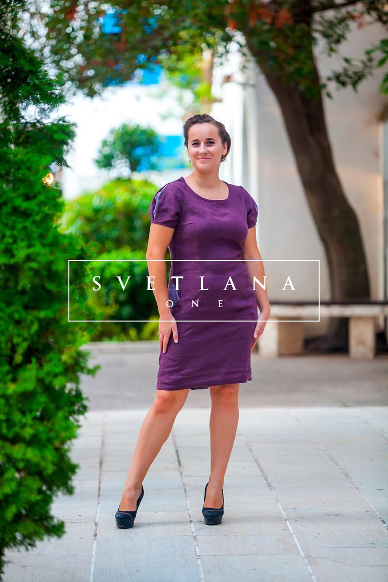 Платье цельнокройное приталенное с коротким рукавом с застежкой-молнией на спинке. Классическая модель дополнена отделочными элементами-вставками сиреневого цвета в области рукавов, карманов и разреза.