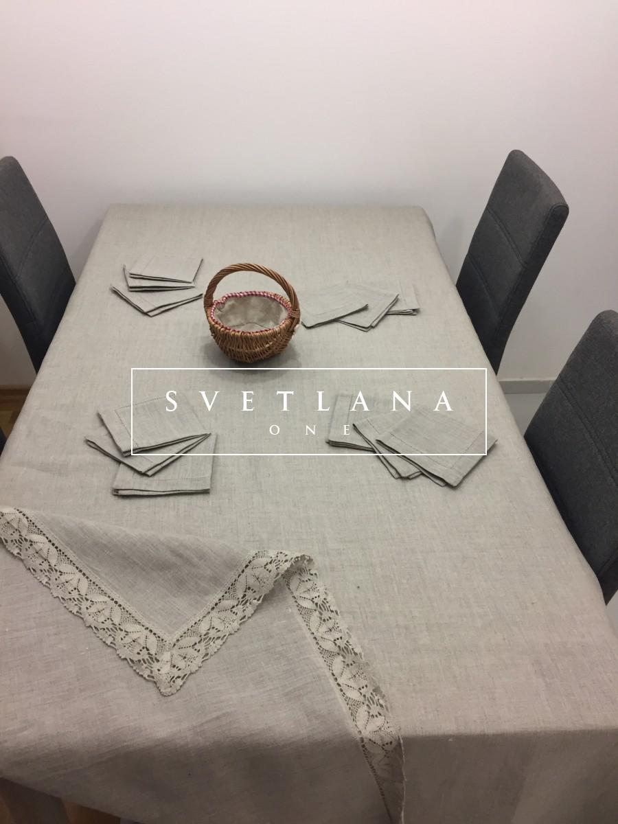 Позвольте себе интерьерную роскошь и изысканность, воплощенную в простоте. Скатерть из классического неокрашенного льна в комплекте с 12 сервировочными салфетками. Скатерть с отделкой из широкого льняного кружева, салфетки с кантом, выполненным в технике машинной мережки. С таким комплектом Вы решите вопрос сервировки стола, а гостей покорите Вашим чувством стиля и умением создавать уют в доме. Рамер 164 х 264 см, 30 х 30 см. Состав 100% лен.